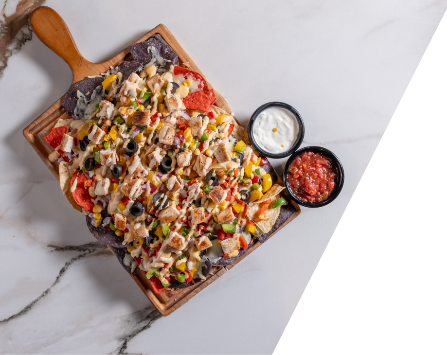 RICE, SMASHED BEEF, RED ONION, PEPPERS, SWEETCORN, LETTUCE, TOMATO, JALAPENOS, GHERKINS, PERI SAUCE AND HOMEMADE GARLIC SAUCE